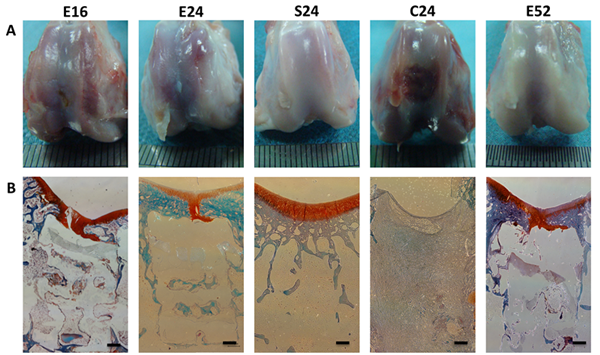 以聚乙二醇水凝胶和磷酸钙陶瓷构建的软骨/骨关节体修复兔膝关节大尺寸骨软骨缺损修复实验发现(图6),修复16周(E16)、24周(E24)和52周(E52),随着时间的推进新生的软骨组织得到明显改善。而作为对照的假手术组(S24)和空白对照组(C24)至24周时未见明显成软骨细胞出现。实验证明软骨下骨骨微参数与软骨修复存在明确的相关关系,完整的软骨下骨重建对软骨修复具有重要意义。