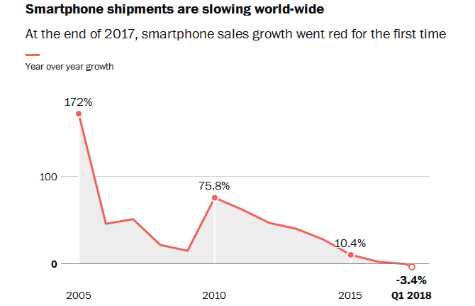 全球智能手机出货量正在变少,截至2017年年底,手机销量增长首次转为负值