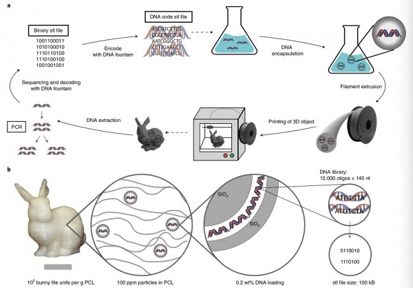 以色列计算遗传学家亚尼夫·埃尔利赫和罗伯特·格拉斯等人,开发了“万物DNA”存储架构,它可以生成具有不变记忆的材料。为了检验这一方法,他们将常见的计算机图形测试模型“斯坦福兔子”的蓝图编码为DNA兼容格式,再将其存储在DNA分子中,进而将DNA分子封装在二氧化硅小球内,将小球嵌入可生物降解的热塑性聚酯中,最后使用所得的热塑性聚酯3D打印了“兔子”。