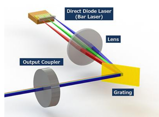 松下公司将100多个二极管发射器与WBC技术相结合,从而提升高光束质量蓝色激光器(波段为400 - 450nm)的输出功率。这种WBC技术可聚集多个不同波长发射器的光束,使其以每个波长对应的角度入射到衍射光栅上。然后,在共用半透明镜体和发射器各边缘面之间,形成谐振器。最后,输出光束功率达到135 W。接下来,松下将开发一套配备这种激光束源的加工系统,并优化激光加工工艺。