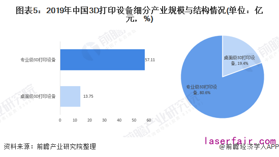 2019年,中国3D打印设备产业结构中,专业级3D打印设备产业规模57.11亿元,占比达到80.6%;桌面级3D打印设备产业规模13.75亿元,占比19.4%。