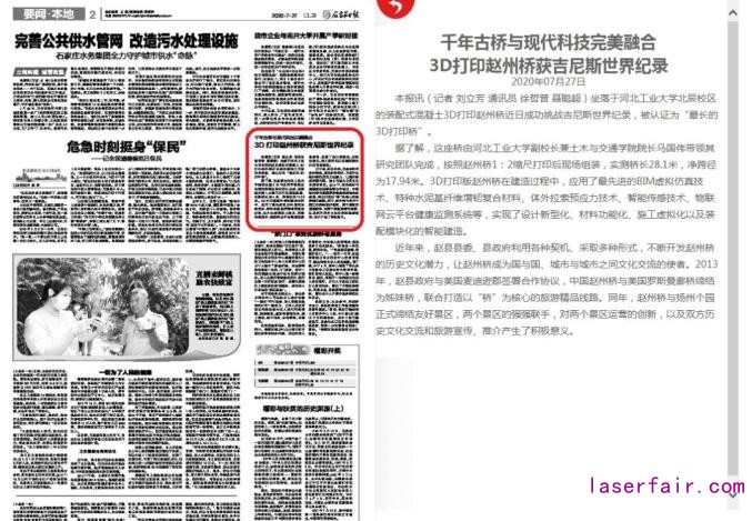 新华社石家庄7月22日电(记者杜一方)坐落于河北工业大学北辰校区的装配式混凝土3D打印赵州桥日前成功挑战吉尼斯世界纪录,被认证为“最长的3D打印桥”。