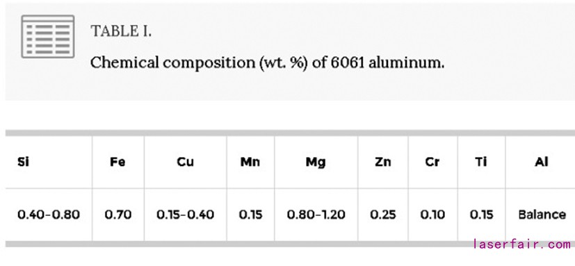 研究人员选用的基体材料是初始T6条件下的6061铝合金,厚度是3mm。材料被切成150mm×100mm×3mm的几块。基体金属的详细化学成分如表1所示。
