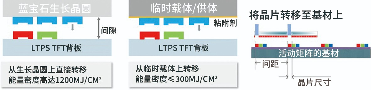 基于激光的质量转移工艺的另一个优点是,已经有将MicroLED转移到基板的成熟方法。如今,一种方法是使用激光剥离步骤将MicroLED从生长晶圆释放到临时载体,然后通过选择性转移步骤将间距增加到显示分辨率。在这里,DUV激光器是激光剥离和转移的最佳选择。另一种减少工艺步骤的方法是直接从生长晶片使用基于激光的传输机制,具有选择性和更少步骤的优势,从而最大限度地减少损坏和不准确风险(如图3所示)。