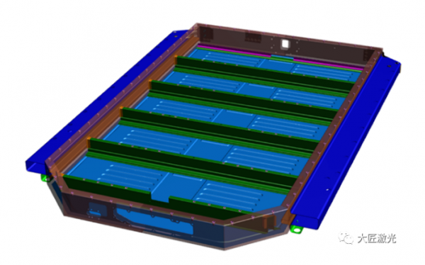 在线激光焊接在新能源高强钢电池托盘上也有广泛的应用。在新能源车上,动力电池系统重量占整车18%-30%,而箱体质量约占电池包总质量的10%~20%。由于电池本身目前的技术限制,作为动力系统最大的结构件电池包托盘是工程师研究轻量化首当其冲的目标。电池托盘材料主要是高强钢或铝合金,但铝合金托盘成本是钢制托盘的2-3倍,从材料到成品的碳排量是钢制托盘的5倍,因此越来越多的厂家开发先进轻量化的高强钢和热成形钢电池托盘代替铝合金托盘,并采用辊压成型、热成形、激光焊接等先进技术,在提高电池包及车身结构安全性的前提下尽可能降低结构的高度、节省空间,降低电池包自身重量。