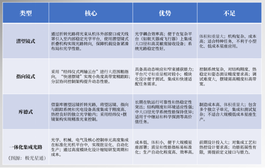 空间激光通信终端的技术演进,是一场由市场需求、工程约束与技术突破共同推动的深刻架构变革。这一发展历程充分体现了从可行性验证到业务化服务,再到产业化部署的战略跃迁,大体可以划分为四个标志性阶段:从注重光路折转与光学效率的潜望镜式架构,发展为适应动态平台的分层指向镜式架构,再过渡到面向长期服务的库德式集成终端,最终迈向支持星座化部署的一体化、可量产终端时代。