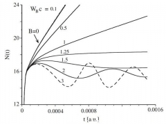 强激光高能量密度物理研究获进展 图1. 不同磁场宽度下正负电子对的产生数随时间的变化关系。其中W B =1.25/c约为电子在磁场中的回旋半径: 磁场宽度小于回旋半径时,粒子数持续产生,系统...