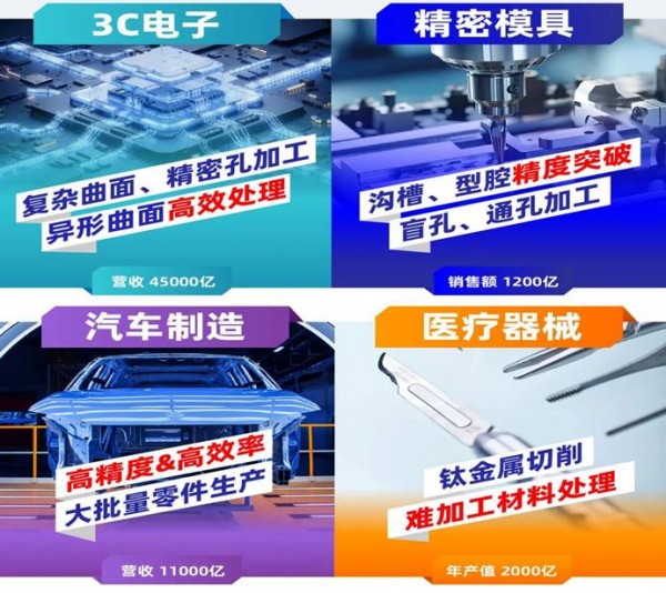 4大应用聚焦,震撼华南!展会聚焦行业精密零件加工,重点锚定3C电子、精密模具、汽车零部件、医疗器械等行业零件加工场景,致力于助力机加工朋友突破高精、高效等加工困局。