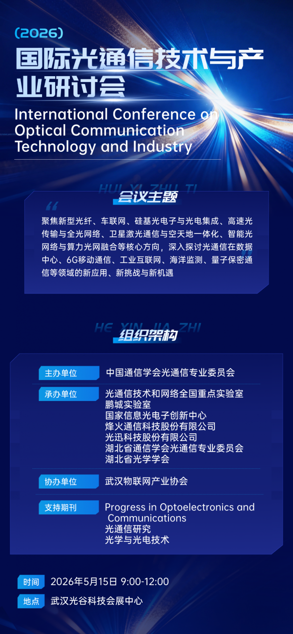 2026年5月15日,中国光谷科技会展中心,2026国际光通信技术与产业研讨会——聚焦超高速、智能化、空天地一体化,探寻下一代光通信的真实边界。